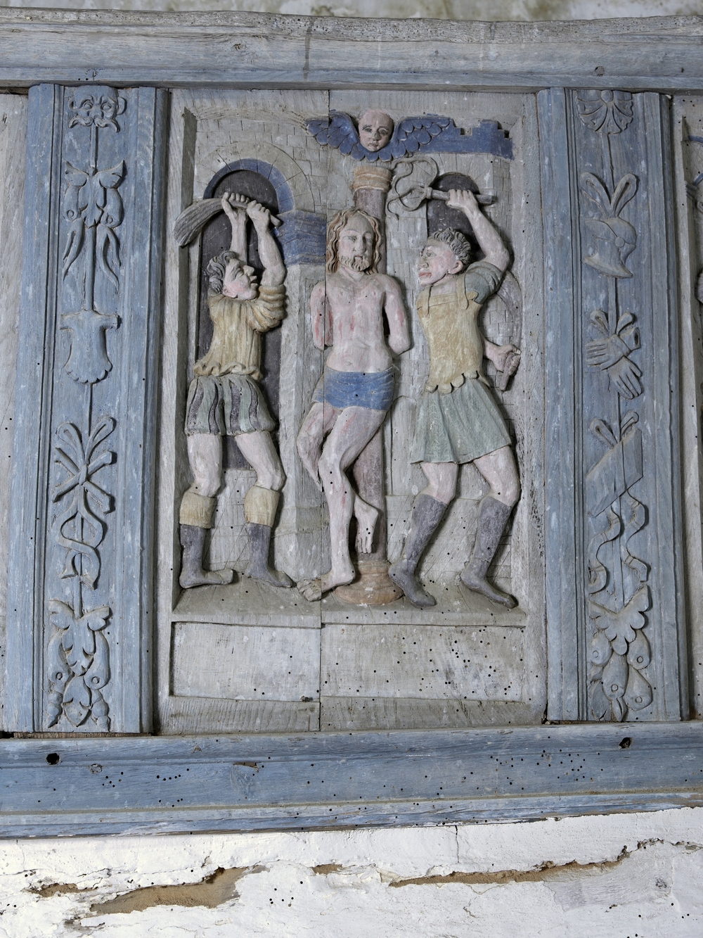 Tribune en bois polychrome, compartiment sculpté représentant des scènes de la Passion, la flagellation du ChristImmatriculation
