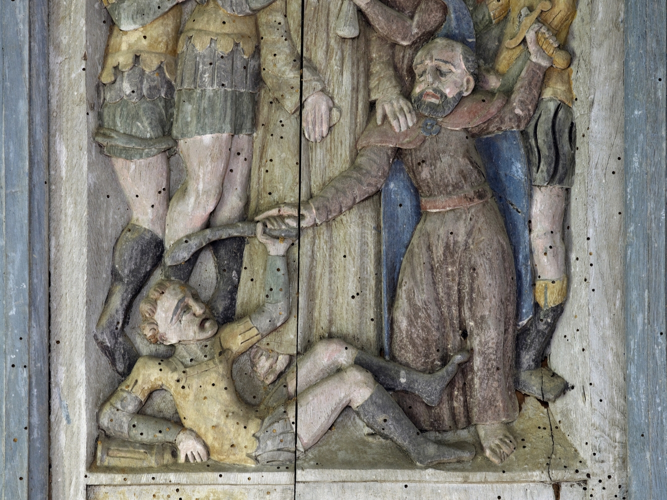 Tribune en bois polychrome, compartiment sculpté représentant des scènes de la Passion, le baiser de JudasImmatriculation