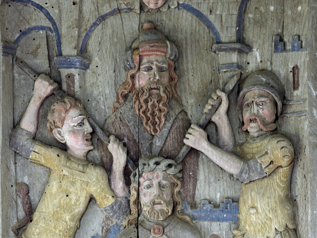 Tribune en bois polychrome, compartiment sculpté représentant des scènes de la Passion, le Christ aux liensImmatriculation
