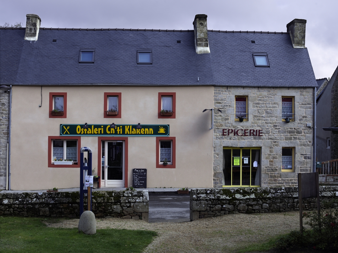 Trégrom, le bourg : restaurant, débit de boissons et magasin de commerce (épicerie)Immatriculation