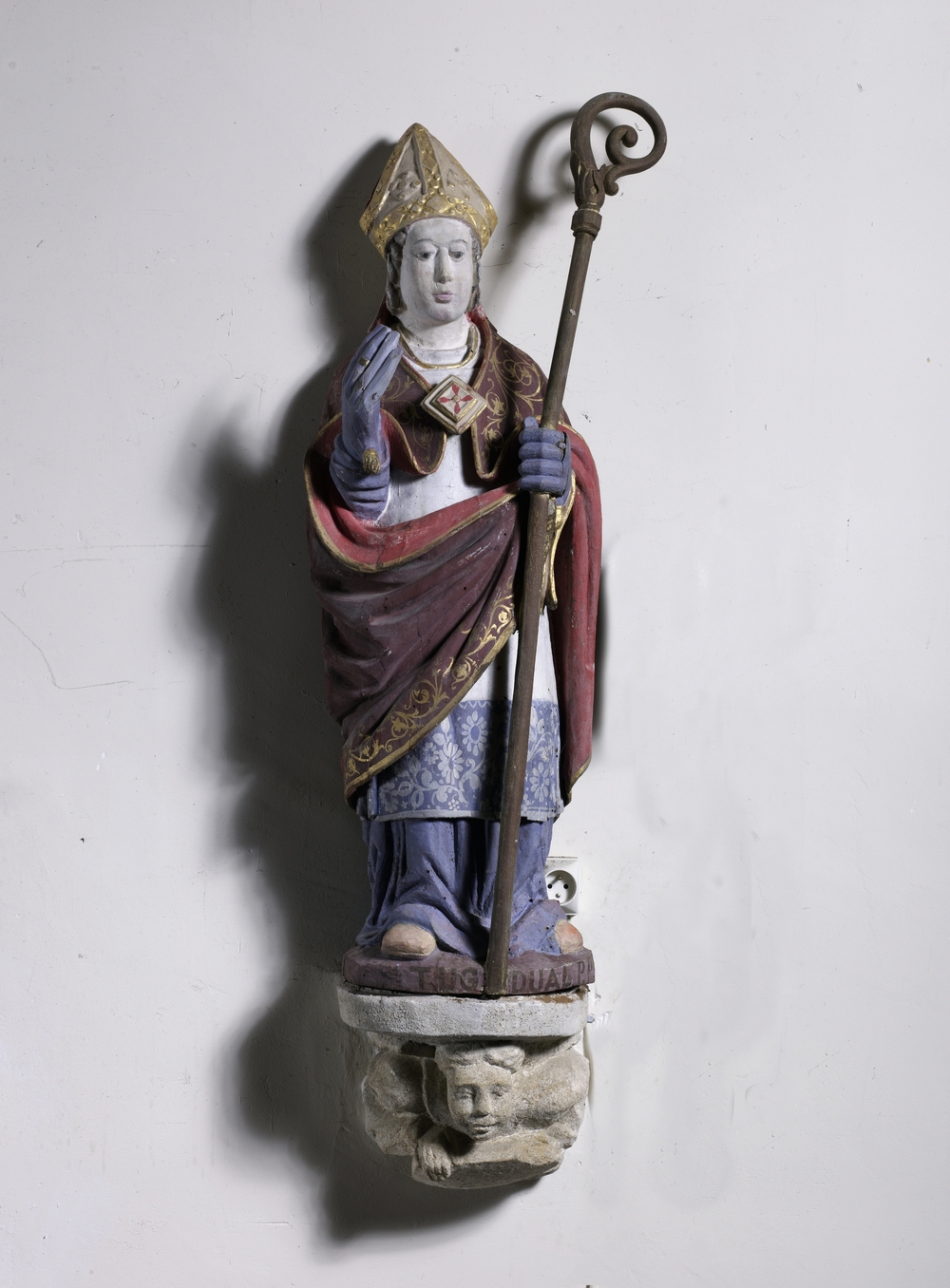 Trégrom, le bourg : église paroissiale Saint-Brandan, vue intérieure, statue représentant saint TugdualImmatriculation