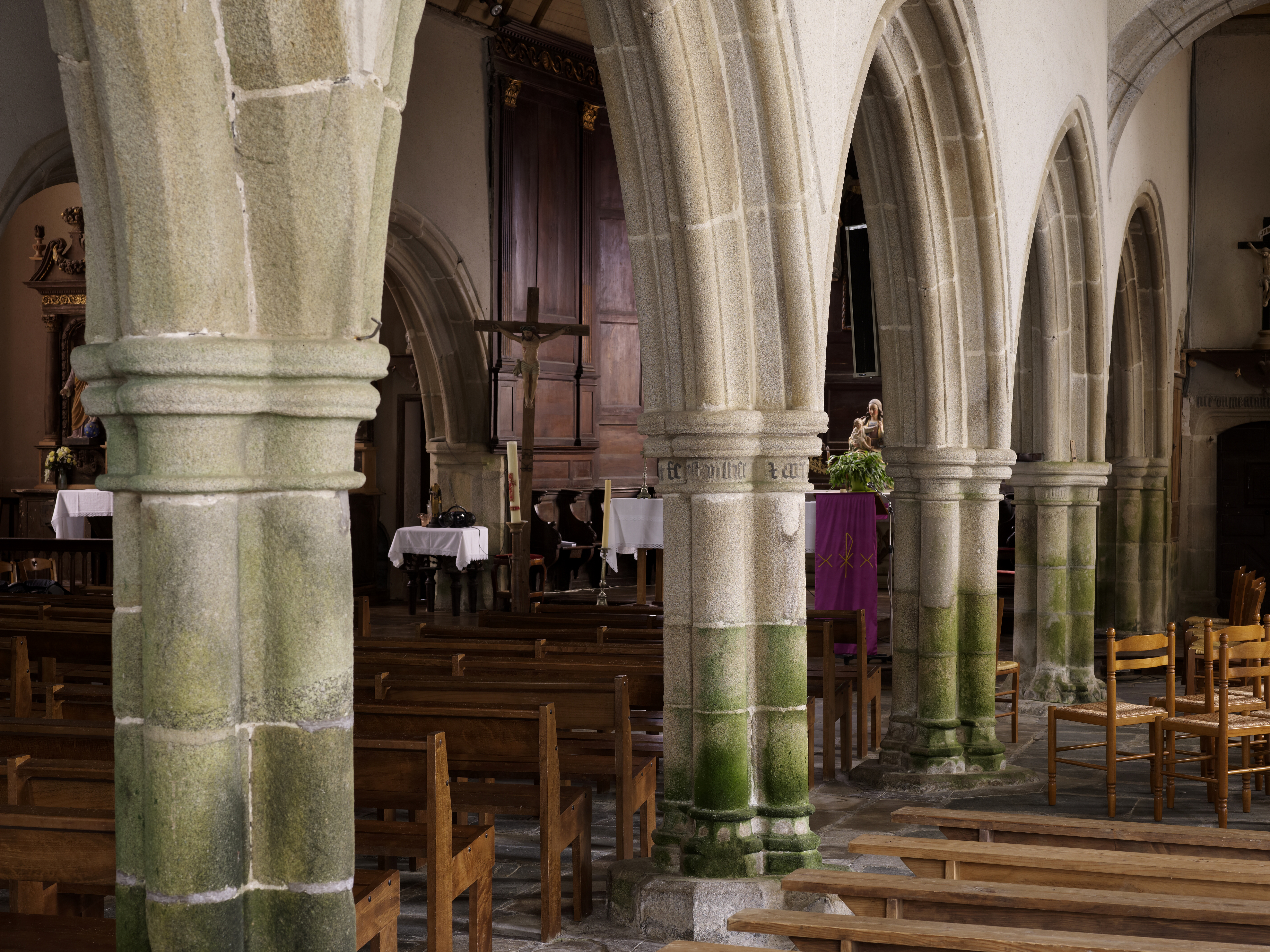 Cavan, le bourg : église paroissiale Saint-Chéron, vue intérieure, détail des piliers sud datables du 15e siècle. Deux piliers portent des noms : O. Perennes ; D. Collas ; Bouhic ; I. Doré ; Rollant Keradun ; GouverneurImmatriculation