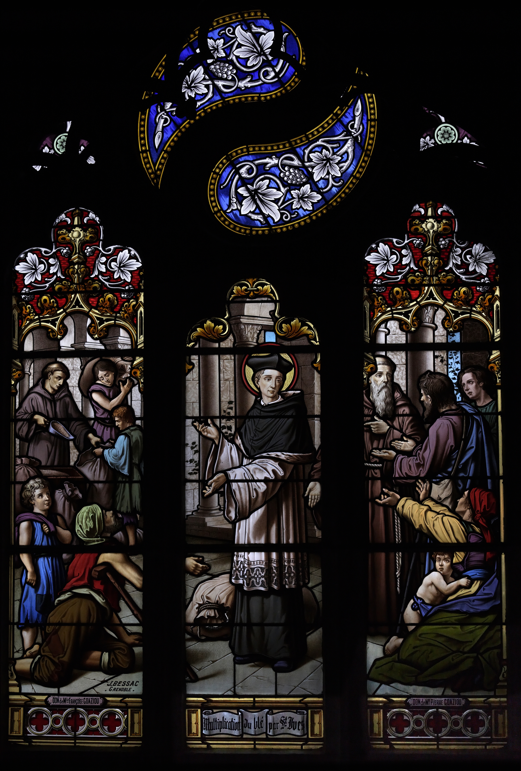 Cavan, le bourg : église paroissiale Saint-Chéron, vue intérieure, vitrail représentant le miracle de la multiplication du blé de saint Yves par J. BESSAC, peintre-verrier de Grenoble en IsèreImmatriculation