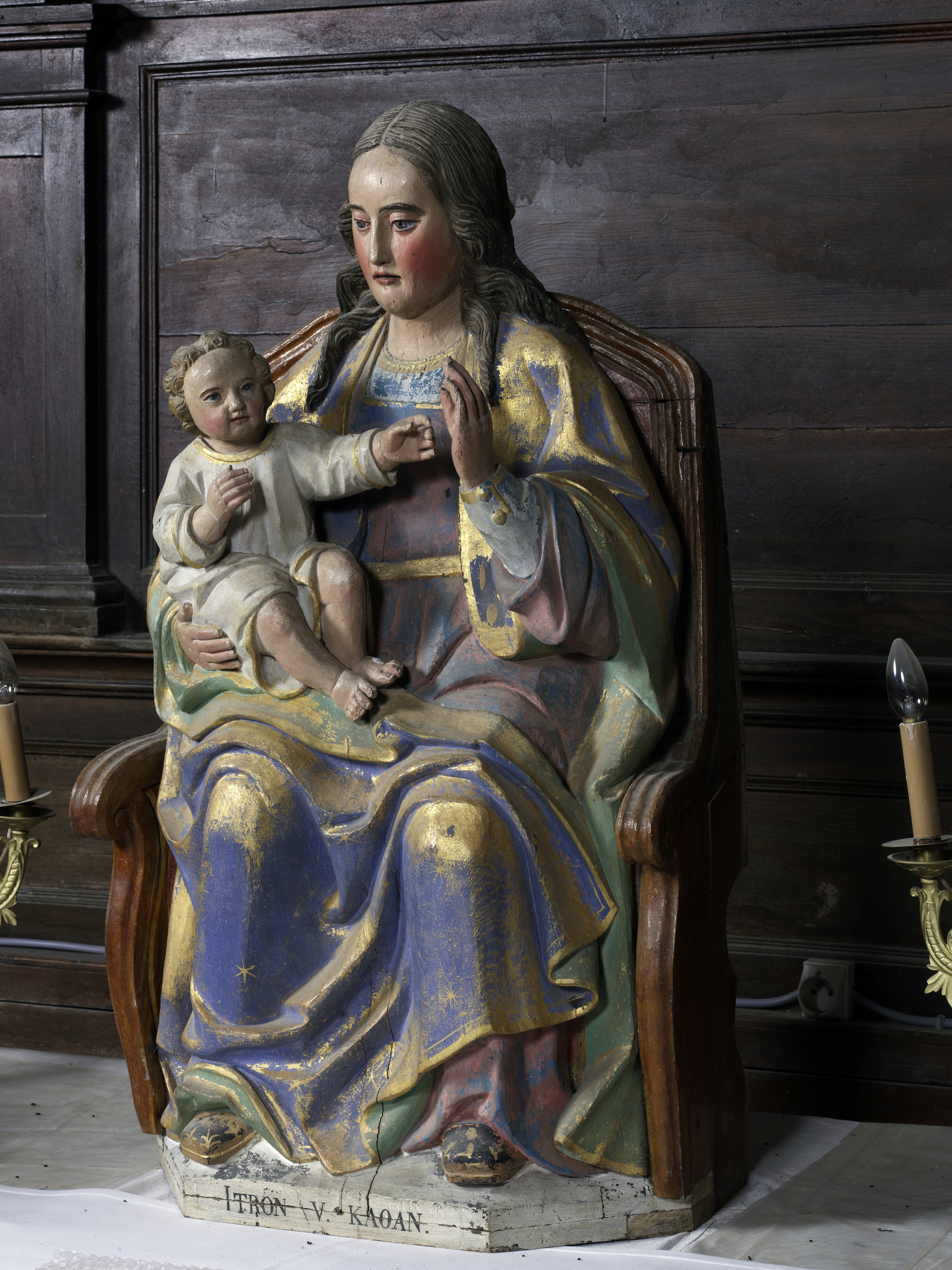 Cavan, le bourg : église paroissiale Saint-Chéron, vue intérieure, statue représentant une Vierge à l'enfantImmatriculation