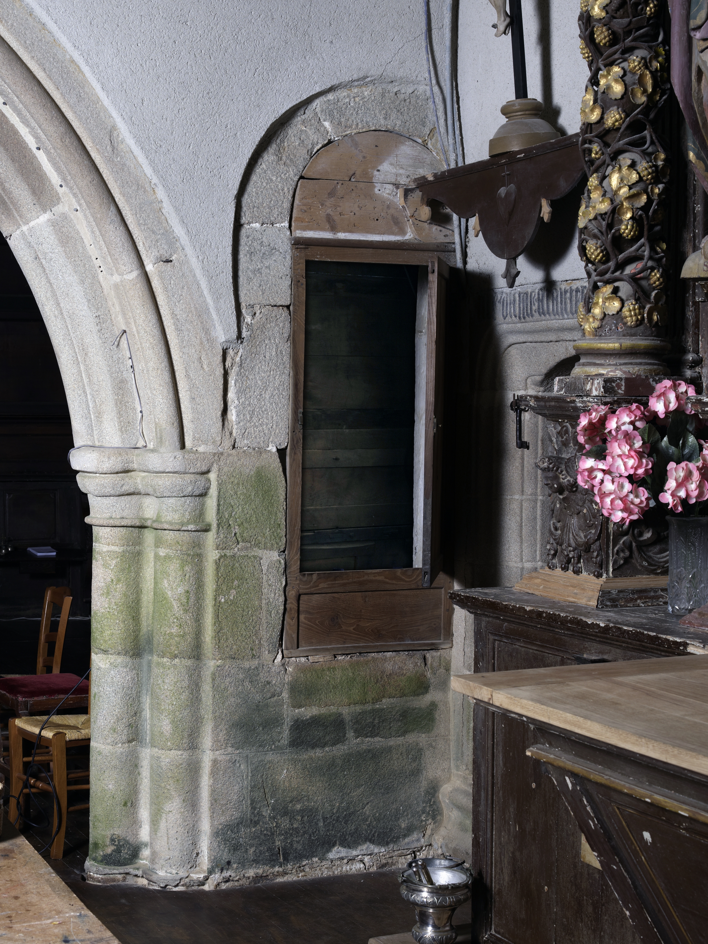 Cavan, le bourg : église paroissiale Saint-Chéron, vue intérieure, ancien escalier dans le choeurImmatriculation