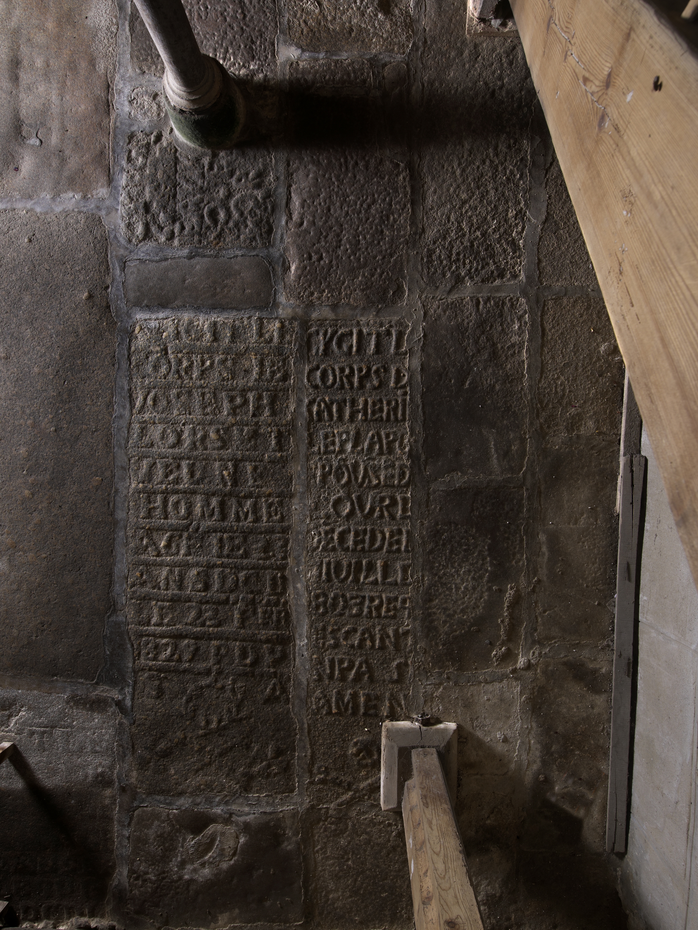 Cavan, le bourg : église paroissiale Saint-Chéron, vue intérieure, dalle funéraire située sous le clocherImmatriculation