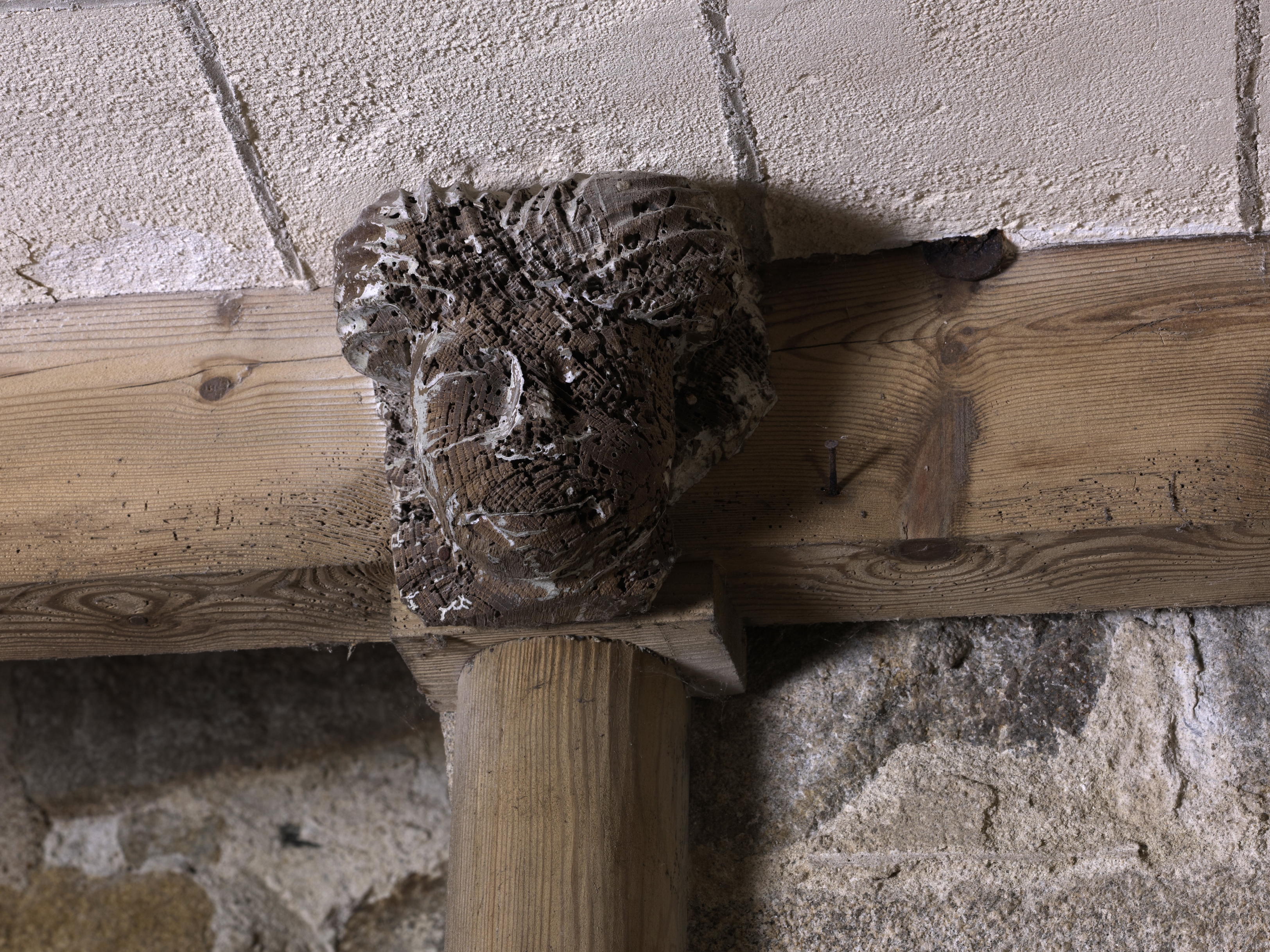 Cavan, le bourg : église paroissiale Saint-Chéron, vue intérieure, ancien décor de la charpente, tête humaineImmatriculation