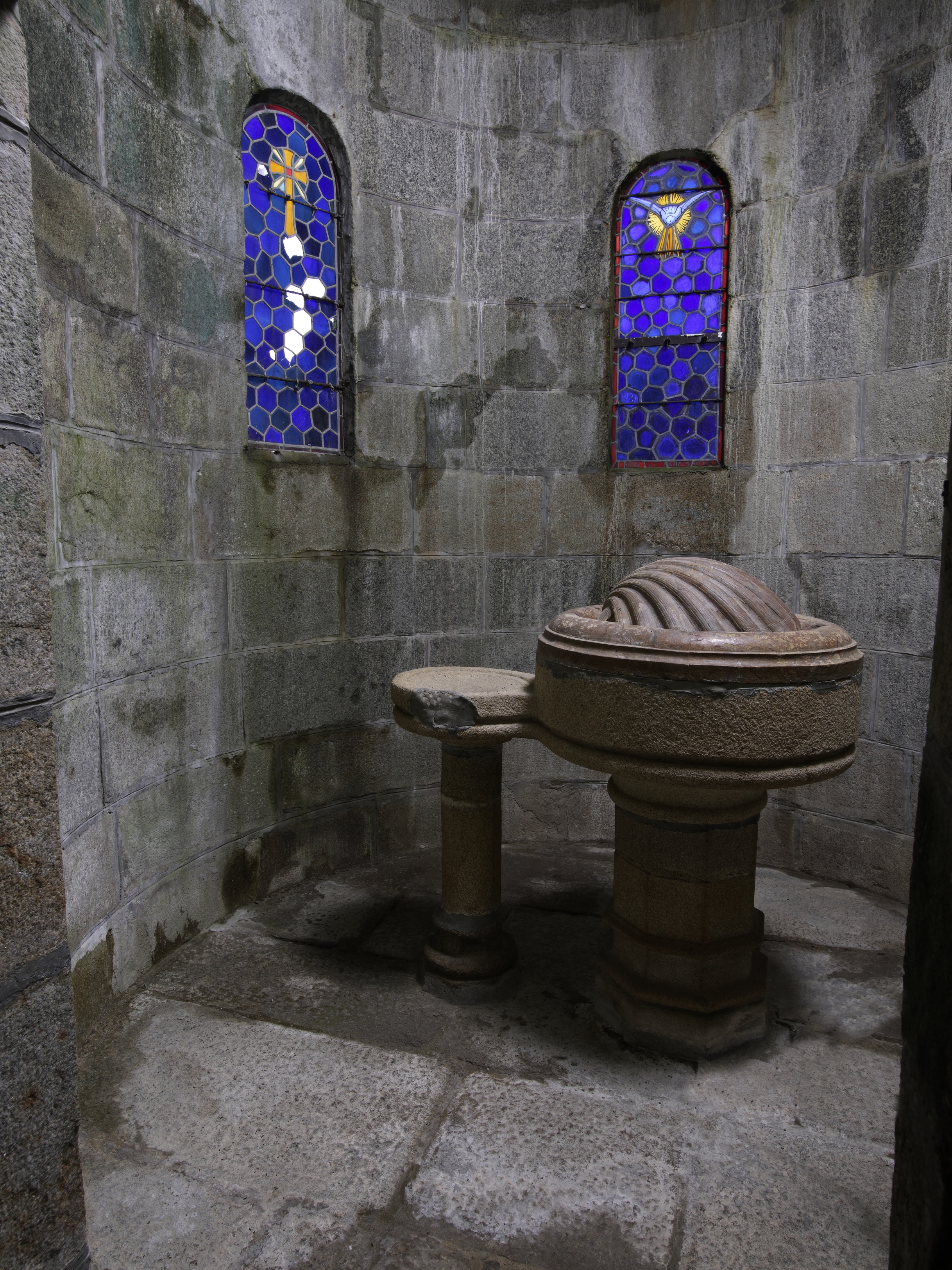 Cavan, le bourg : église paroissiale Saint-Chéron, vue intérieure, fonts baptismauxImmatriculation