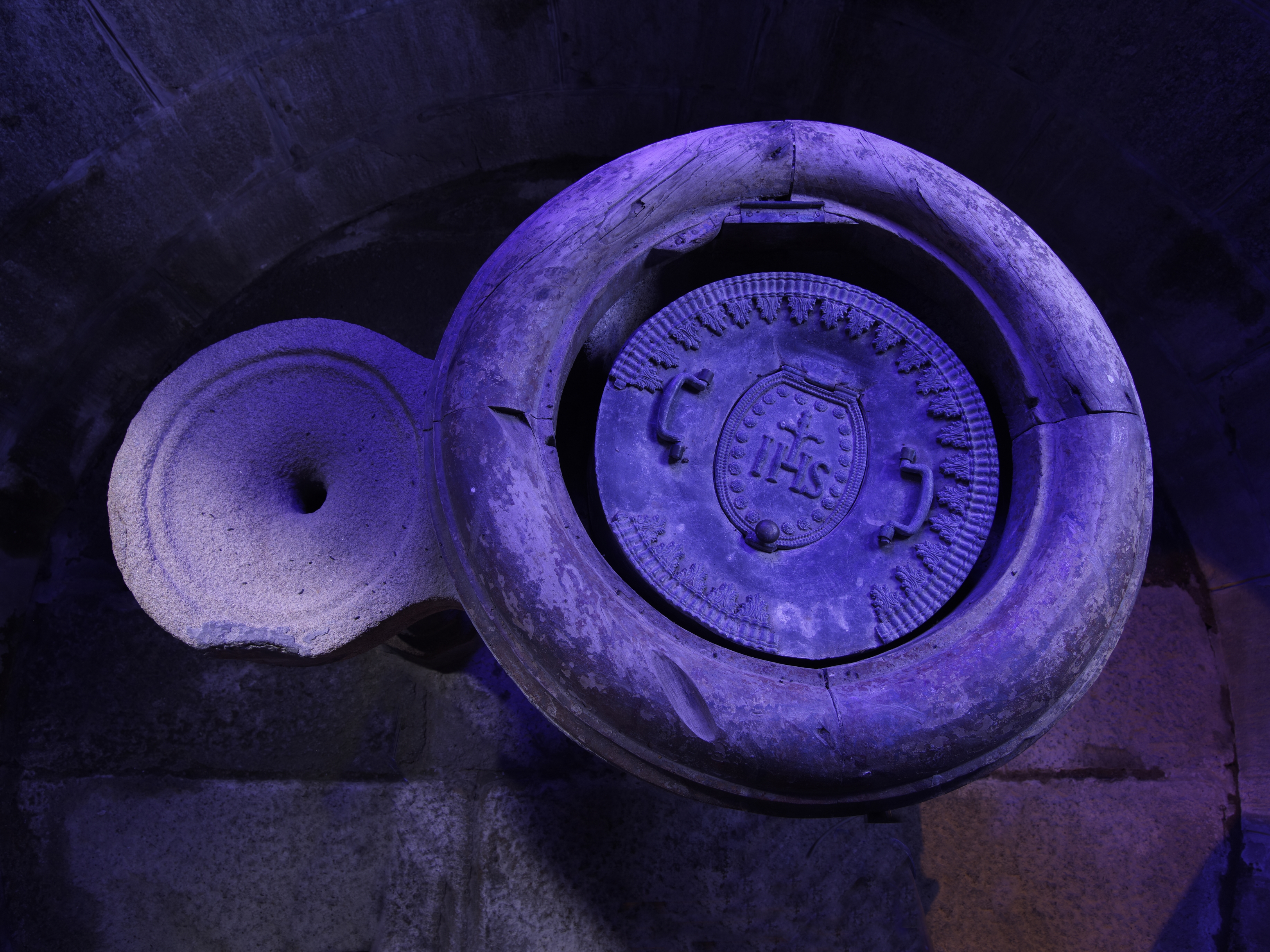 Cavan, le bourg : église paroissiale Saint-Chéron, vue intérieure, détail de la cuve des fonts baptismauxImmatriculation