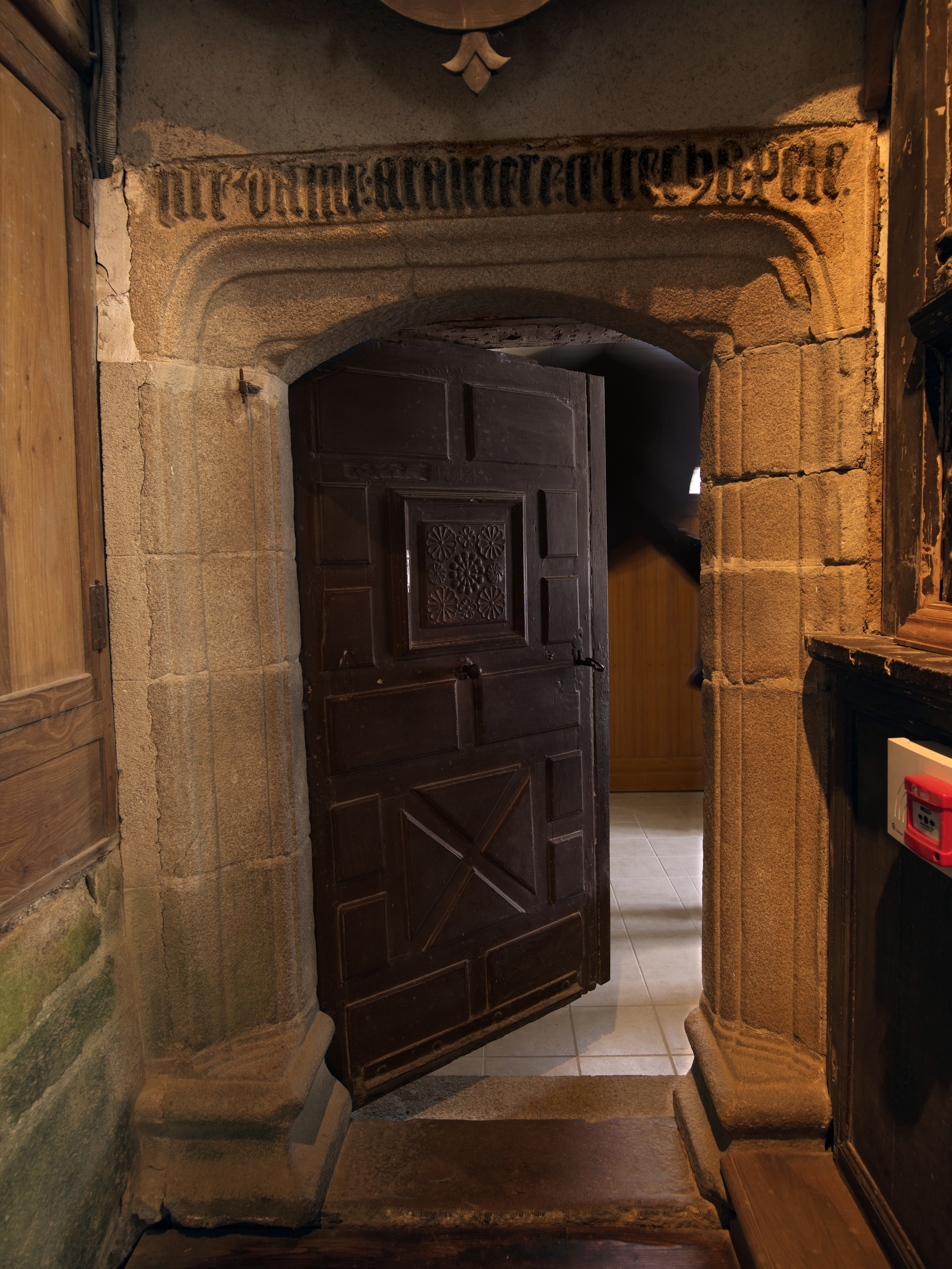 Cavan, le bourg : église paroissiale Saint-Chéron, vue intérieure, porte de la sacristie datée 1614Immatriculation