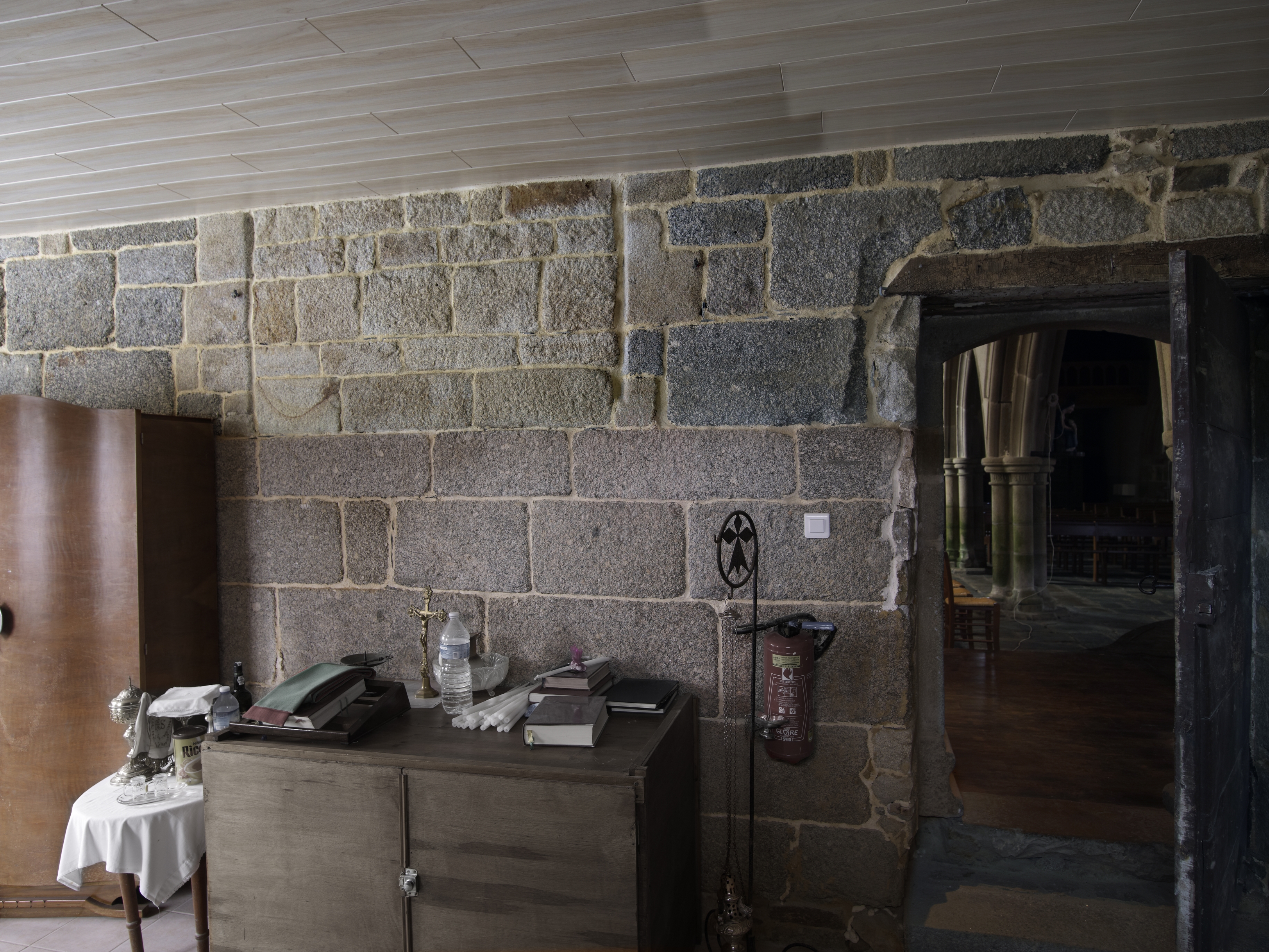 Cavan, le bourg : église paroissiale Saint-Chéron, vue intérieure, fenestage murée dans la sacristieImmatriculation