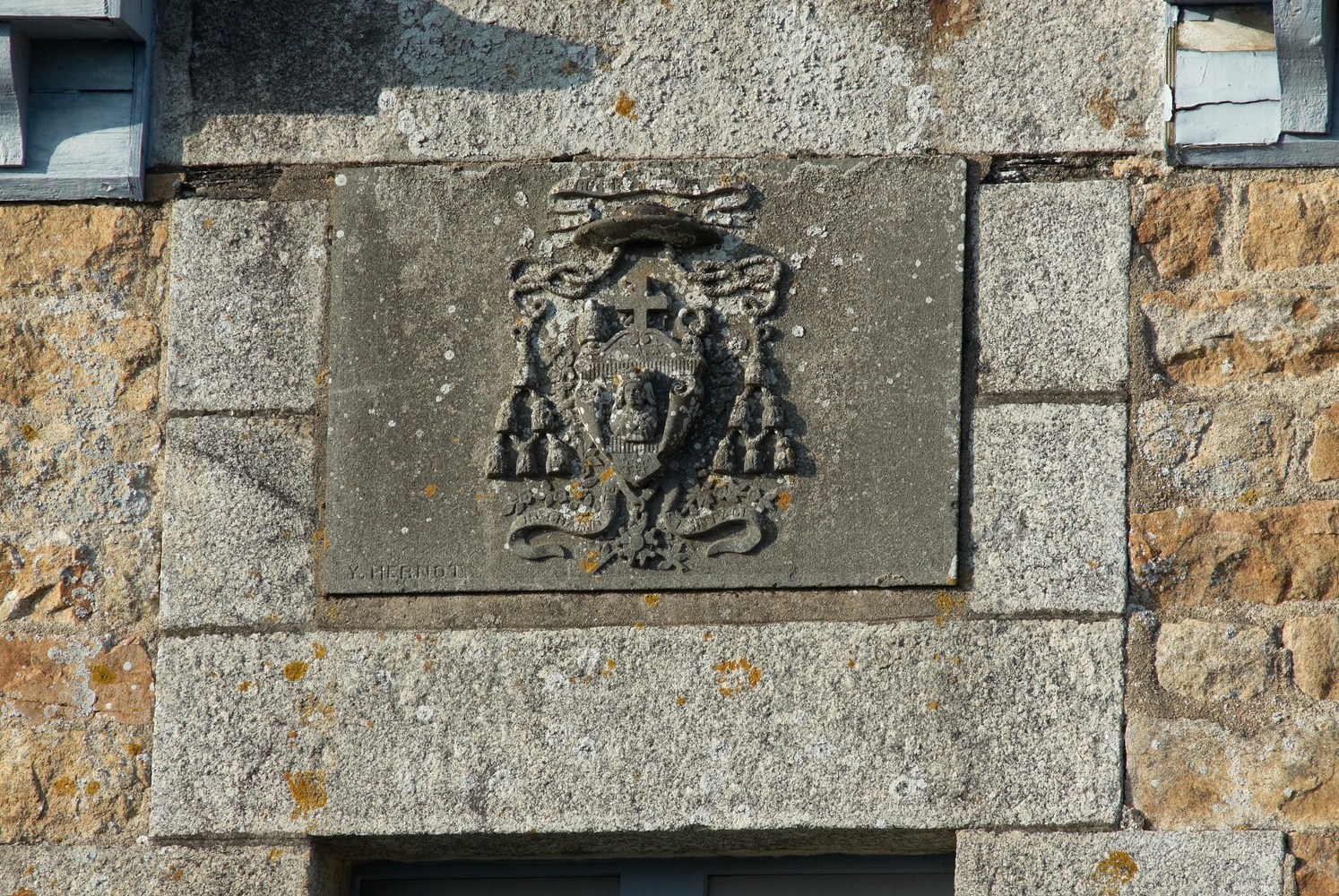 Prat, le bourg : presbytère, élévation antérieure orientée vers le sud-est, armoiries réalisées par le sculpteur Yves Hernot, vue de détailImmatriculation