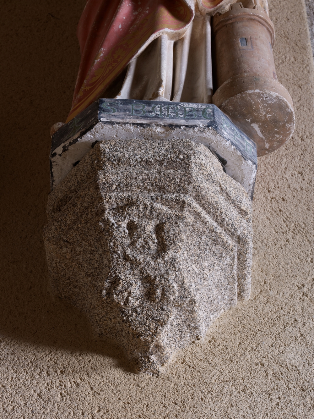Plouaret : chapelle Sainte-Barbe, vue intérieure, choeur, console armoriéeImmatriculation
