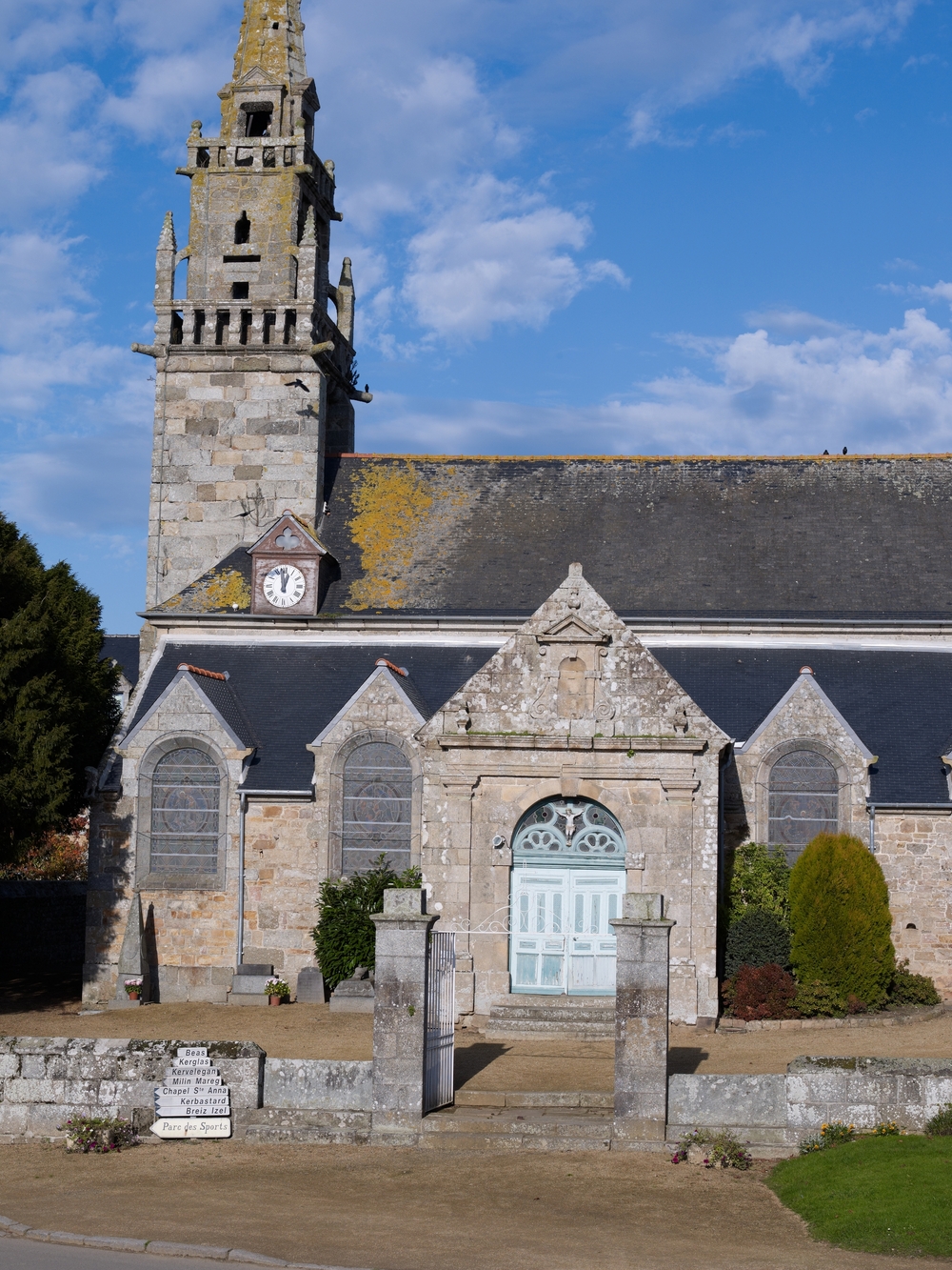 Prat, le bourg : église paroissiale Saint-Pierre, clocher et porche sud, vue généraleImmatriculation