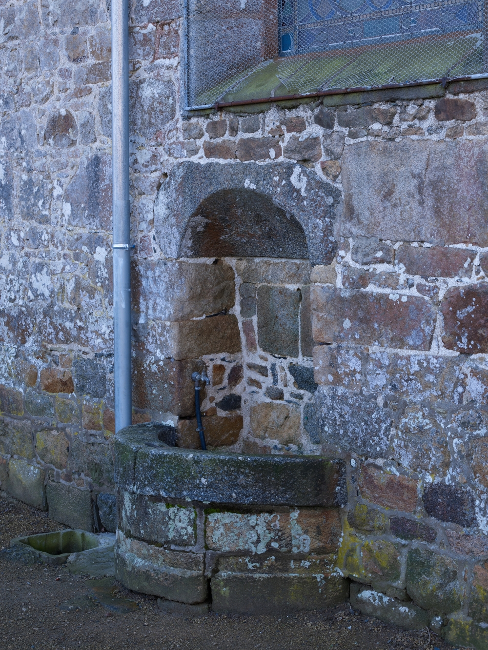 Prat, le bourg : église paroissiale Saint-Pierre, mur nord, puitsImmatriculation