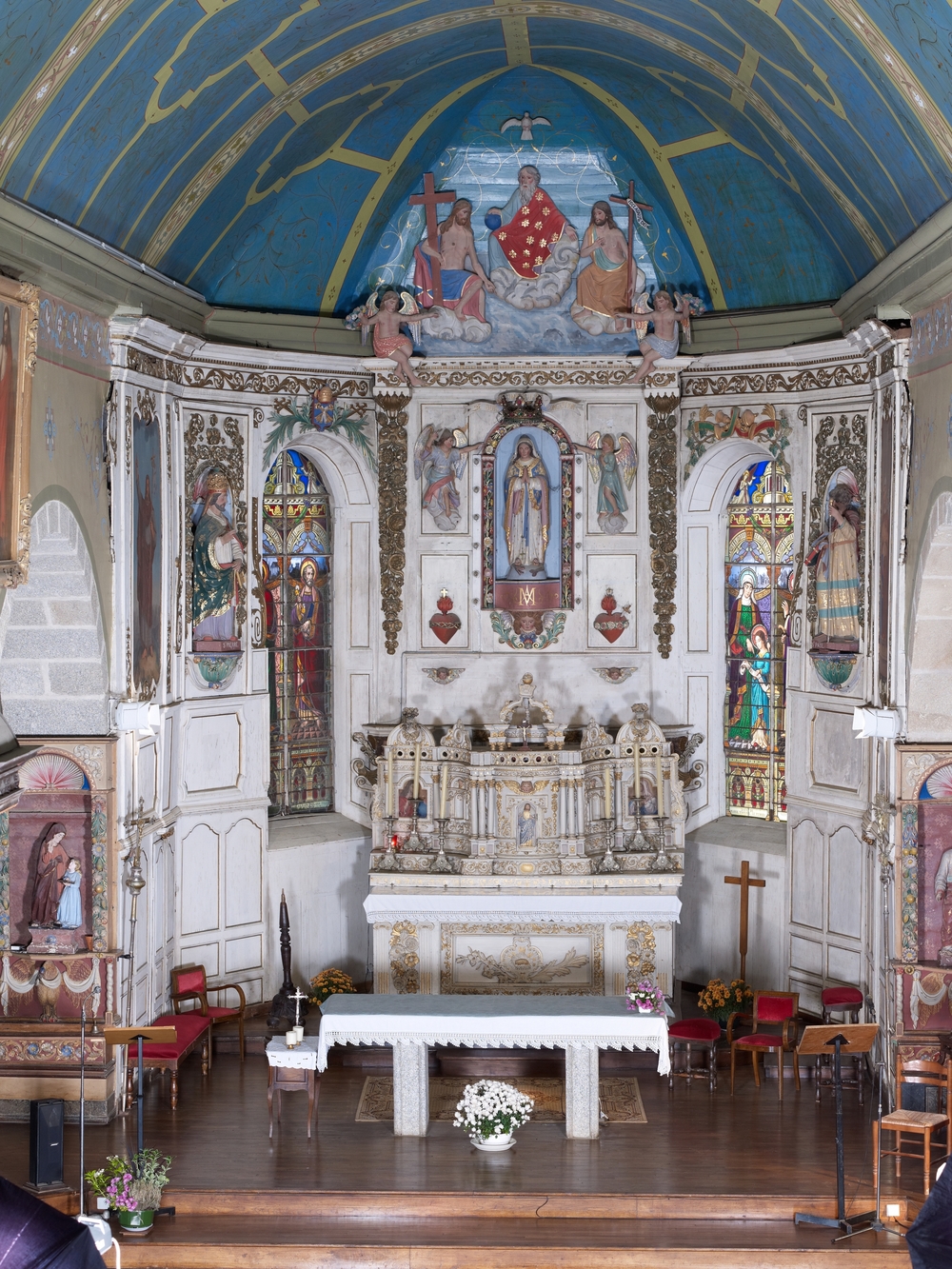 Prat, le bourg : église paroissiale Saint-Pierre, vue intérieure, choeur et maître-autelImmatriculation