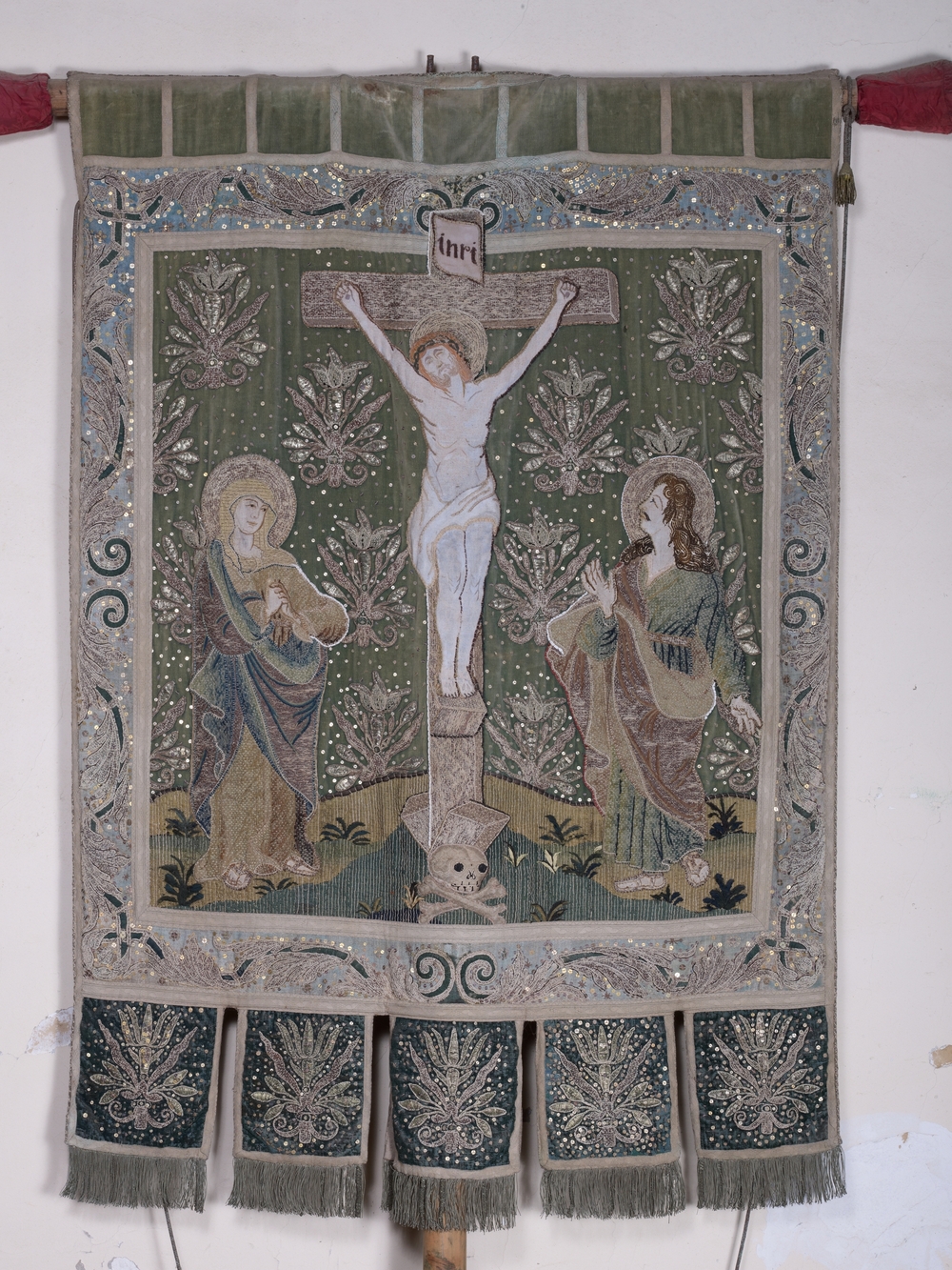 Prat, le bourg : église paroissiale Saint-Pierre, vue intérieure, bannière de processionImmatriculation
