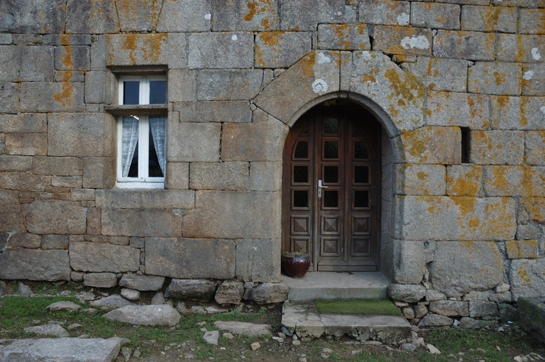 Plouaret, Coat Roué : manoir, élévation antérieure. Détail de la partie est : porte en plein cintre et fenêtre à traverseImmatriculation