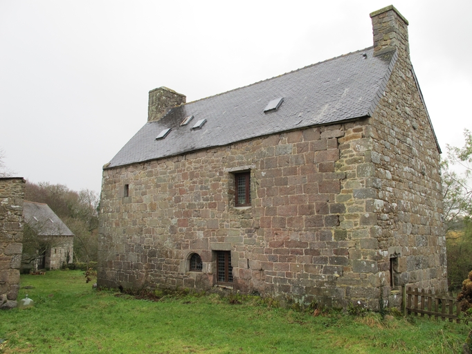 Plouaret, Kerhuon : manoir, élévation nord (manoir remanié et retourné après incendie comme le suggère la couleur rougeâtre du granite : ?). Le pignon ouest a été entièrement remontéImmatriculation