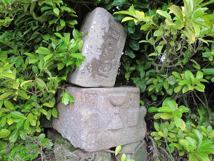 Plouaret, Coat Even : socle de calvaire à griffe orné d'un calice datable du 17e siècle. Il provient du calvaire de la chapelle Saint-Nicolas (situé à l'origine à 400 m à l'ouest). Linteau daté 1651Immatriculation