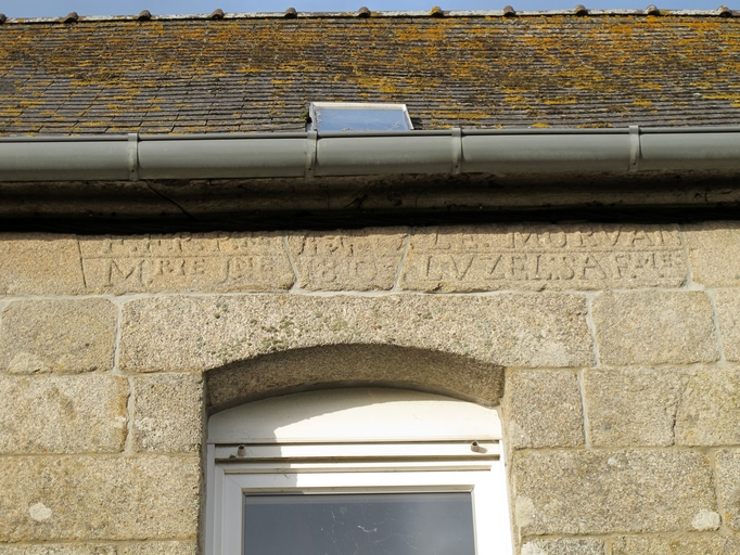 Plouaret, la Garenne : ferme, étage, fenêtre centrale. Les pierres portent le millésime 1810 et l'inscription F.F.P. [fait faire pour] : P.re [Pierre] YVES LE MORVAN M.rie [Marie] J.ne [Jeanne] 1810 LUZEL SA F.ME [femme]Immatriculation