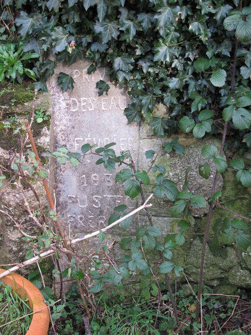 Plouaret, la Garenne : plaque gravée située à côté du puits. Elle porte l'inscription PRIV_ DES EAUX _ FEVRIER 193_ FUSTEC FREREImmatriculation