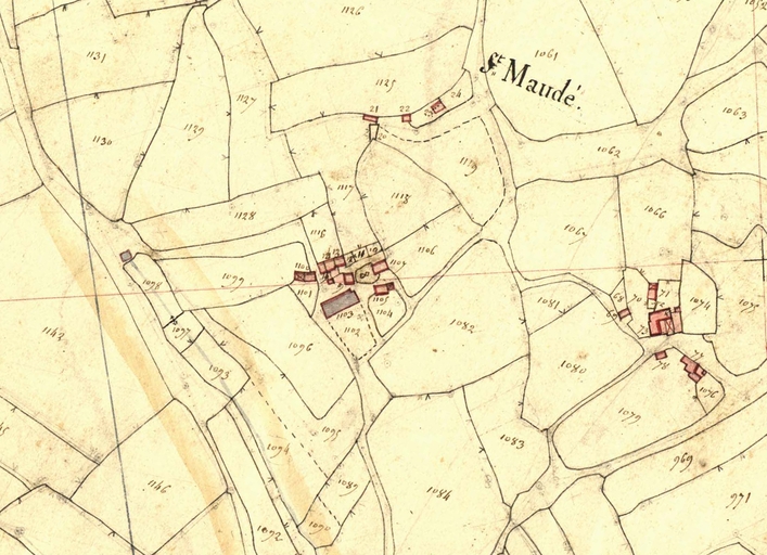 Extrait du cadastre ancien de la commune de Plouaret, 1835 : Maudez (en bleu au centre, la chapelle Saint-Maudez et son calvaire. A l'ouest : la fontaine Saint-Maudez)Immatriculation