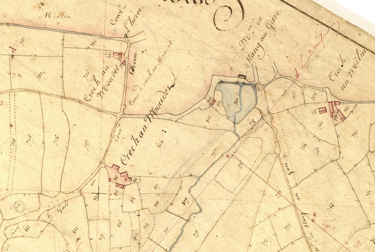 Extrait du cadastre ancien de la commune de Plouaret, 1835 : Crec'h an Moudet, Convenant L'hérec, Moulin de Stang an Garo, Crec'h an MilinImmatriculation