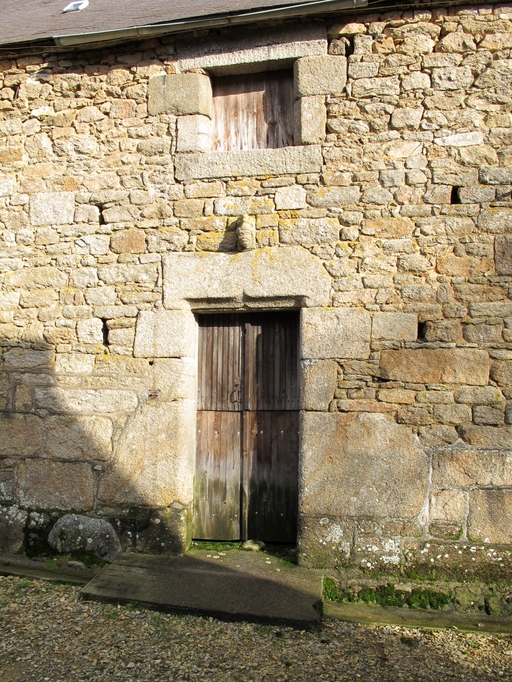 Plouaret, Run Riou : étable, élévation antérieure, porte rectangulaire remployant des éléments de la fin du 16e siècle ou du début du 17e siècle (linteau à double accolade)Immatriculation