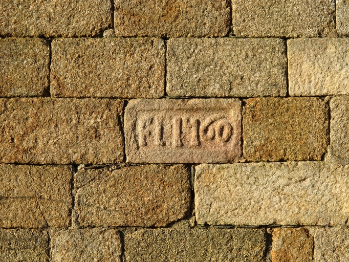 Plouaret, Kervégan : moulin, pignon sud. Une pierre porte l'inscription FI et le chronogramme 1760Immatriculation