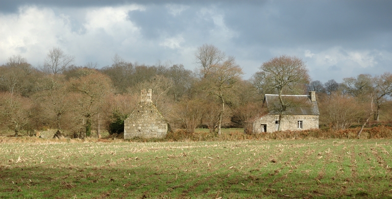 Plouaret : Pabu : fermes aujourd'hui isolées dans les champs. Une fontaine et un lavoir ancien sont envahis par la végétationImmatriculation
