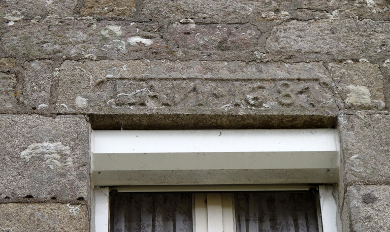 Pluzunet, Germarquer : manoir aujourd'hui ferme, élévation postérieure orientée vers le nord, détail du linteau portant le millésime et l'inscription L'AN 1681Immatriculation
