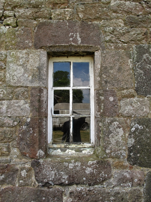 Pluzunet, Pen Lan : manoir puis ferme, élévation antérieure orientée vers le nord-est, détail d'une fenêtre avec linteau en accolade et chanfrein en cavetImmatriculation