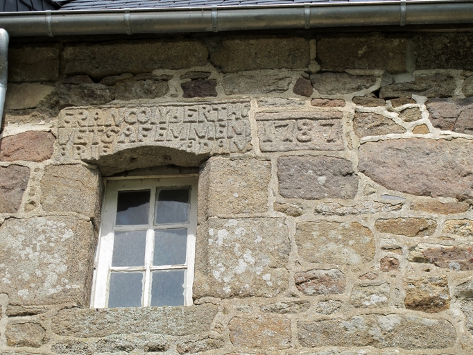 Pluzunet, Pen Lan : manoir puis ferme, élévation postérieure orientée vers le sud-ouest, détail d'une fenêtre avec linteau en arc segmentaire portant l'inscription et le millésime FRANCOIS BERTHOV ET SA FEMME MARIE ADAN / 1787Immatriculation