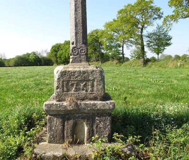 Pluzunet, route de Tonquédec : croix de chemin, détail du socle daté 1741Immatriculation