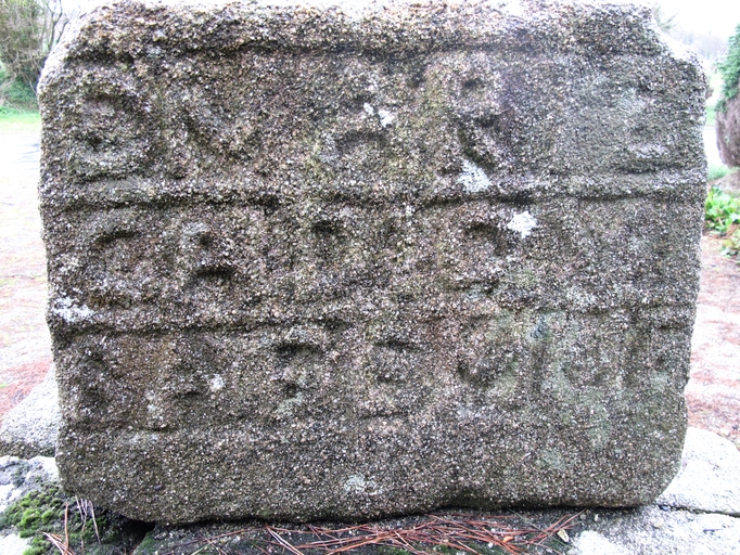 Caouënnec-Lanvézéac, Caouënnec, Castel Pic (rue) : croix (1772), détail du socleImmatriculation