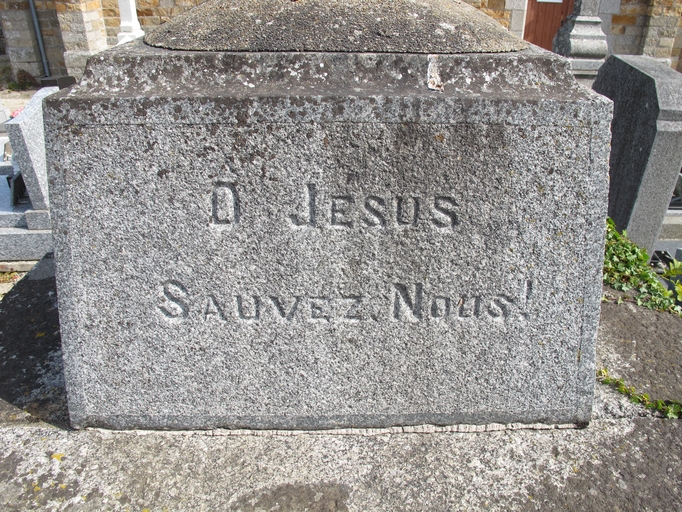 Coatascorn, le bourg : croix de cimetière, détail du socleImmatriculation