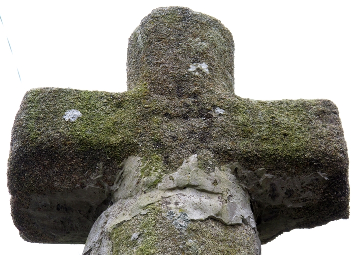 Cavan, Bardérou : croix de chemin, vue de détail, sculpture représentant une croix du Sacré-CœurImmatriculation