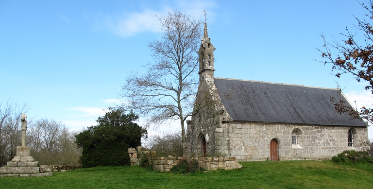Tonquédec, Kerrivoalan : chapelle Notre-Dame et sa croix, vue générale sudImmatriculation