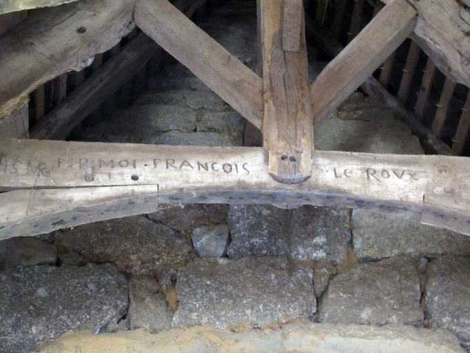 Tonquédec, le Loc : chapelle, vue intérieure, détail de la charpente ancienne. Elle porte l'inscription suivante : F : P : MOI FRANCOIS LE ROUXImmatriculation