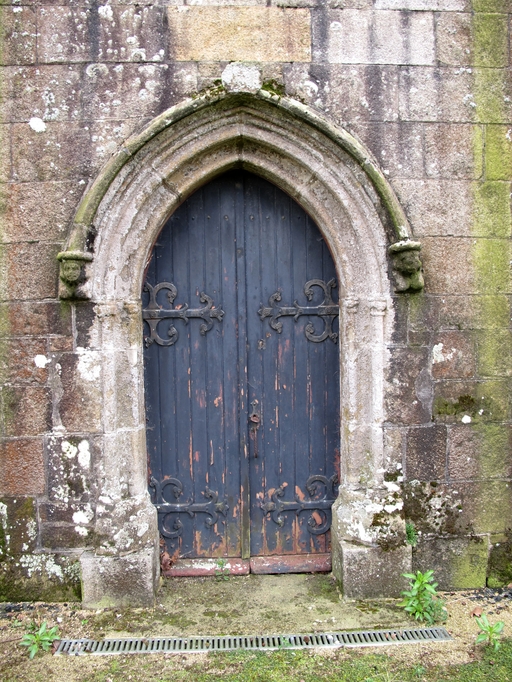Tonquédec, le bourg : église paroissiale Saint-Pierre, entrée nord, porte, vue de détailImmatriculation