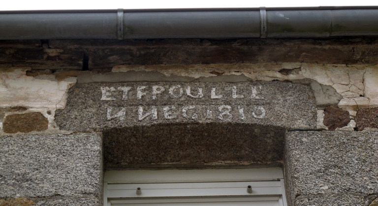 Tonquédec, le Minihy : ferme, élévation antérieure orientée vers le sud-sud-est. Le linteau de fenêtre porte l'inscription suivante : ET FPOULLE NNEG 1810Immatriculation