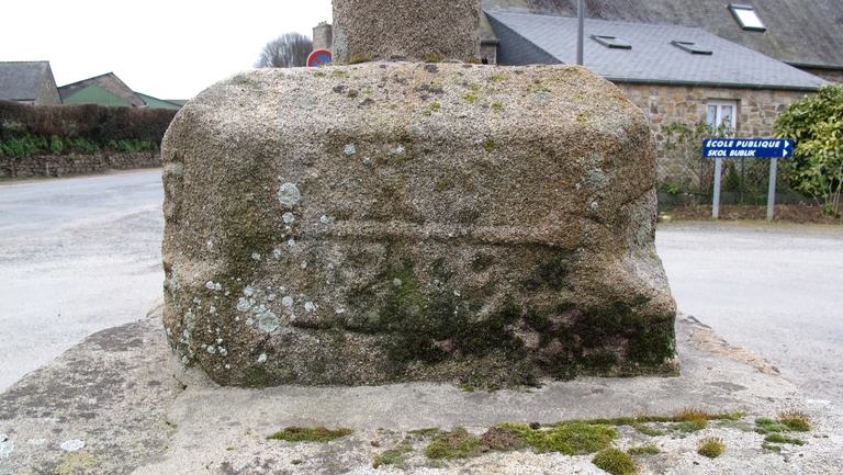 Tonquédec, le bourg, rue de la Mairie : croix de chemin, socle, vue de détail. Il porte le millésime 1819 ou 1839 (?)Immatriculation