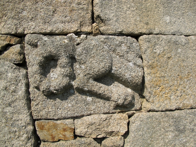 Tonquédec, Loguivy : ferme (1ère moitié 19e siècle), élévation antérieure orientée vers le sud-sud-est, pierre sculptée en remploi (édifice religieux)Immatriculation