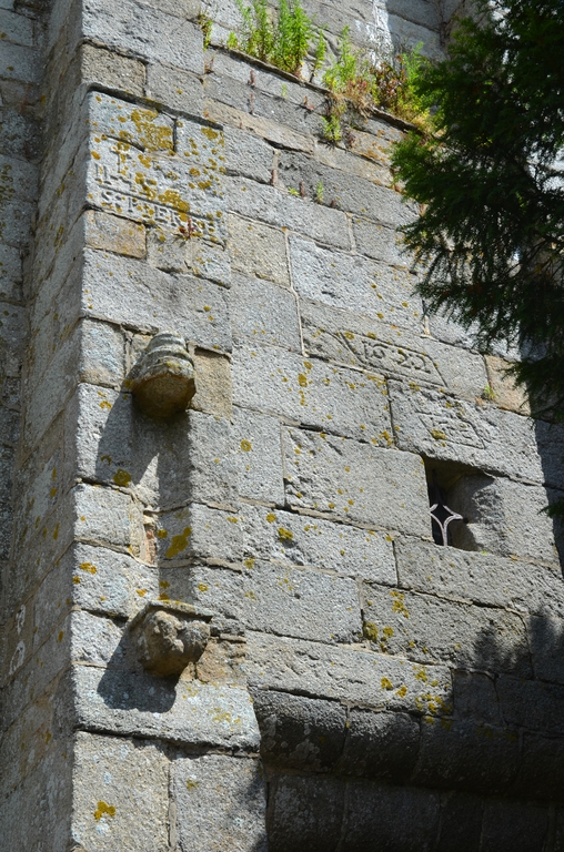 Prat, le bourg : église paroissiale Saint-Pierre, clocher, inscription et millésime, IHS S : PIERRE / 1622, vue de détailImmatriculation