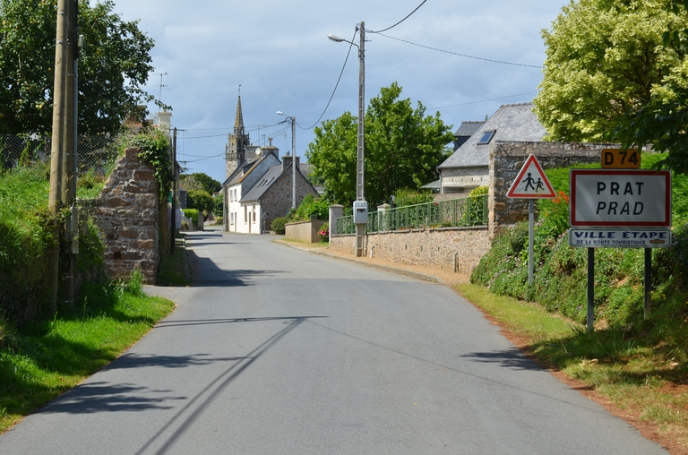 Prat, le bourg, route de Pouloguer : entrée de village et signalétique depuis le sud-estImmatriculation