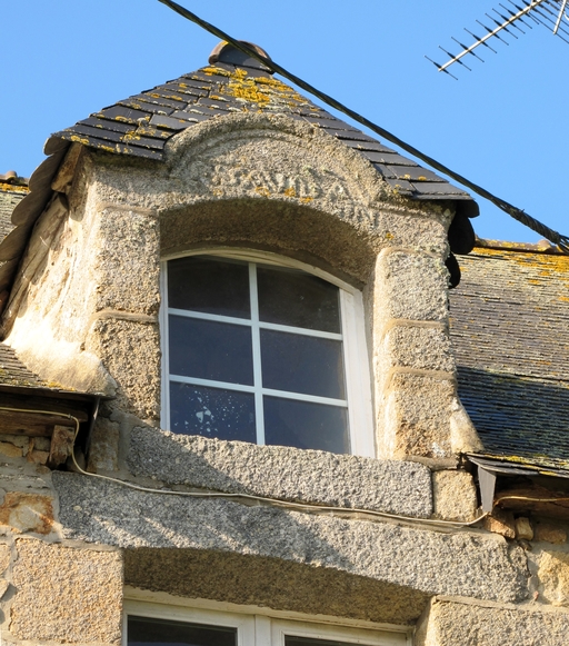 Prat, Kermerrien : manoir puis ferme, élévation antérieure orientée vers l'est, vue de détail. La lucarne porte l'inscription suivante : F : SAVIDA [N : ?]Immatriculation