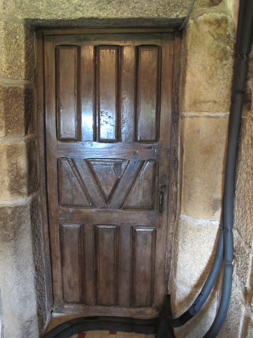 Prat, Kermerrien : manoir puis ferme, vue intérieure, rez-de-chaussée (actuel couloir), porte arrière à linteau droit desservant la tour d'escalier, huisserie et porte (2e moitié18e siècle)Immatriculation