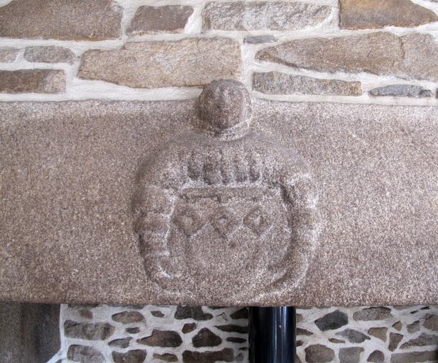 Prat, Kerouguy : ferme (sur le site d'un ancien manoir), cheminée, armoiries, vue de détail. Il s'agit des armoiries de la famille Le Chevoir. Prigent Le Chevoir est seigneur de KerouguyImmatriculation