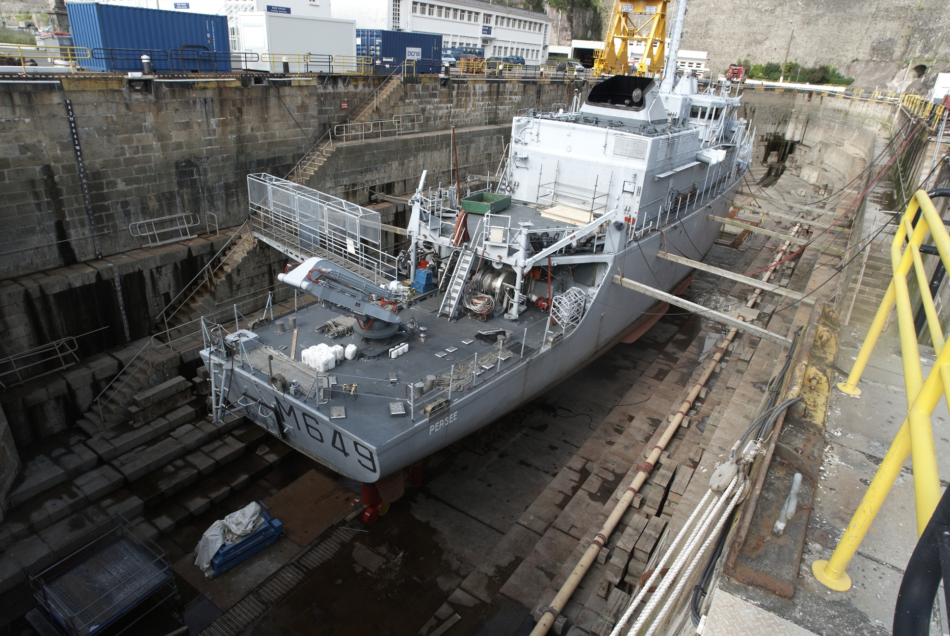 Brest, dans l´enceinte de l´arsenal : forme de Troulan actuellement bassin n° 1 dit bassin Tourville. Le navire Persée, immatriculé M 649, est un des 13 chasseurs de mines français du type tripartite (CMT)Immatriculation